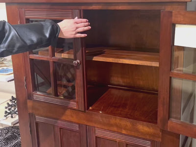 細かく桟で区切られたガラスが光を柔らかく分散し、中に並べたグラスや器、ボトル、古書などを、静かに引き立ててくれます。框組みの扉と細い桟は、機械的な大量生産では出せない、わずかな面取りや角の表情があり、近くで見るほど「手の仕事」が伝わってきます。