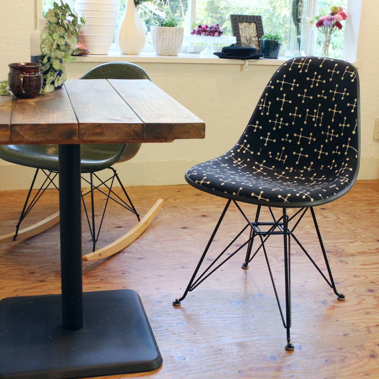 ハーマンミラー社製・イームズデザインのヴィンテージ、サイドシェルチェア/ワイヤーベースです。 ロゴが小文字のHermanMiller社名の入ったエンボスは3rdモデルで、1983年製と思われます。背座は張替えがされていまして、「スモールドットパターン」ファブリック。これは、チャールズ&レイ・イームズが1947年にデザインしたものです。クッション性があり長時間座っても大丈夫!布張りなのでお尻のひんやりもありません。ベース部分はおそらくリプロダクト品のワイヤーベースです(エッフェルベースとも呼ばれます)。ヴィンテージですが、かなり状態の良いチェアです。『これだ!』と思った方は買いです。とても希少な1脚です。