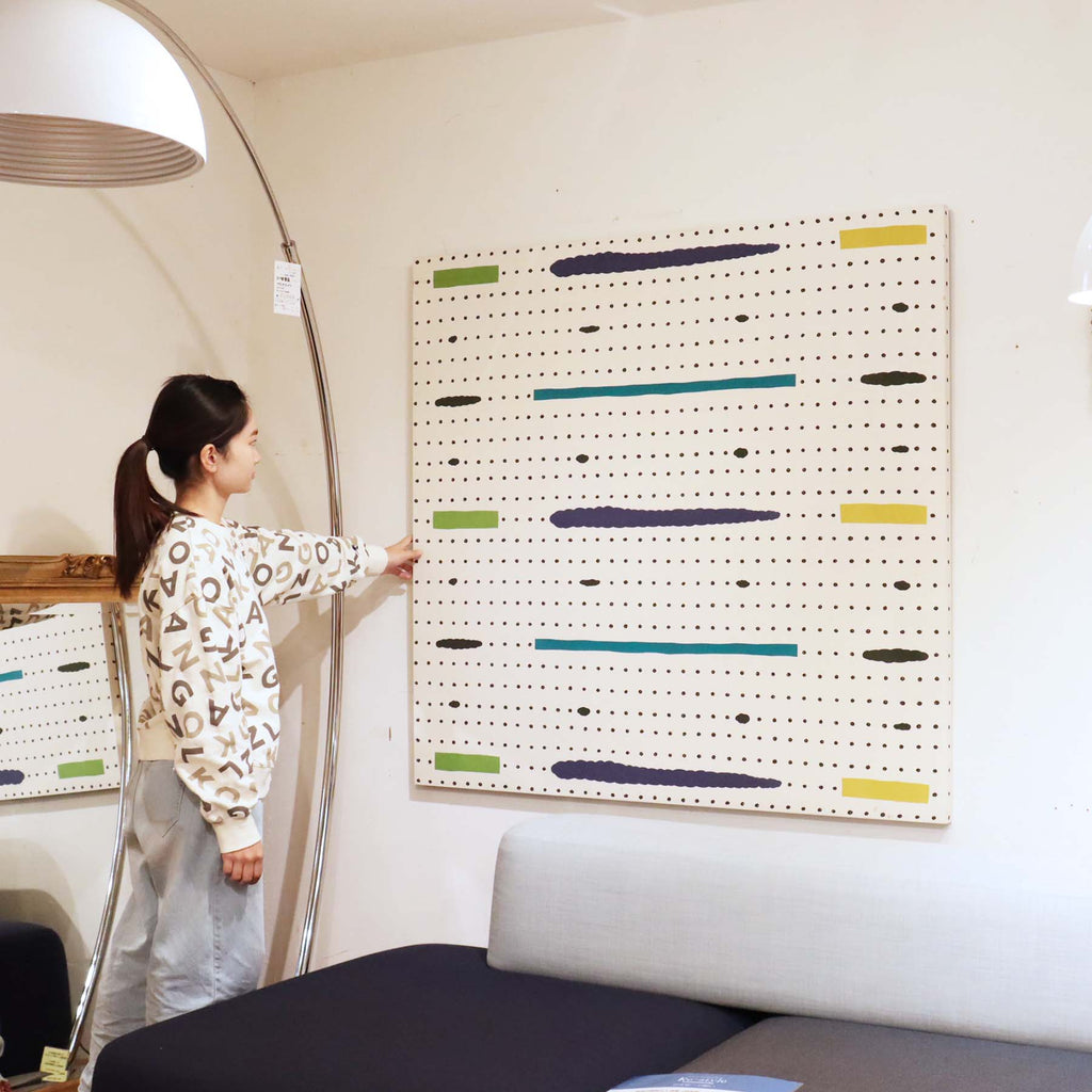 黒のドットと色鮮やかなラインや模様が描かれた目を引くデザインで、部屋に飾ってあるだけで空間が明るくなります。ファブリックパネルは1枚あるとお部屋にアートな空間が漂います。 ファブリックパネルの発祥の地は北欧。寒い北欧では家で過ごす時間が多いので、お部屋の中を少しでも華やかに彩り楽しむために工夫されていたんですね。 北欧ブランドのテキスタイルもカラフルな色合いや大胆な柄の美しいデザインが多いですね。これだけ大きなものですと、お部屋に入ったときの印象がガラッと変わります。壁がさみしいな何か飾りたいなと思っていた人にはぜひ。店舗さまにもオススメです。