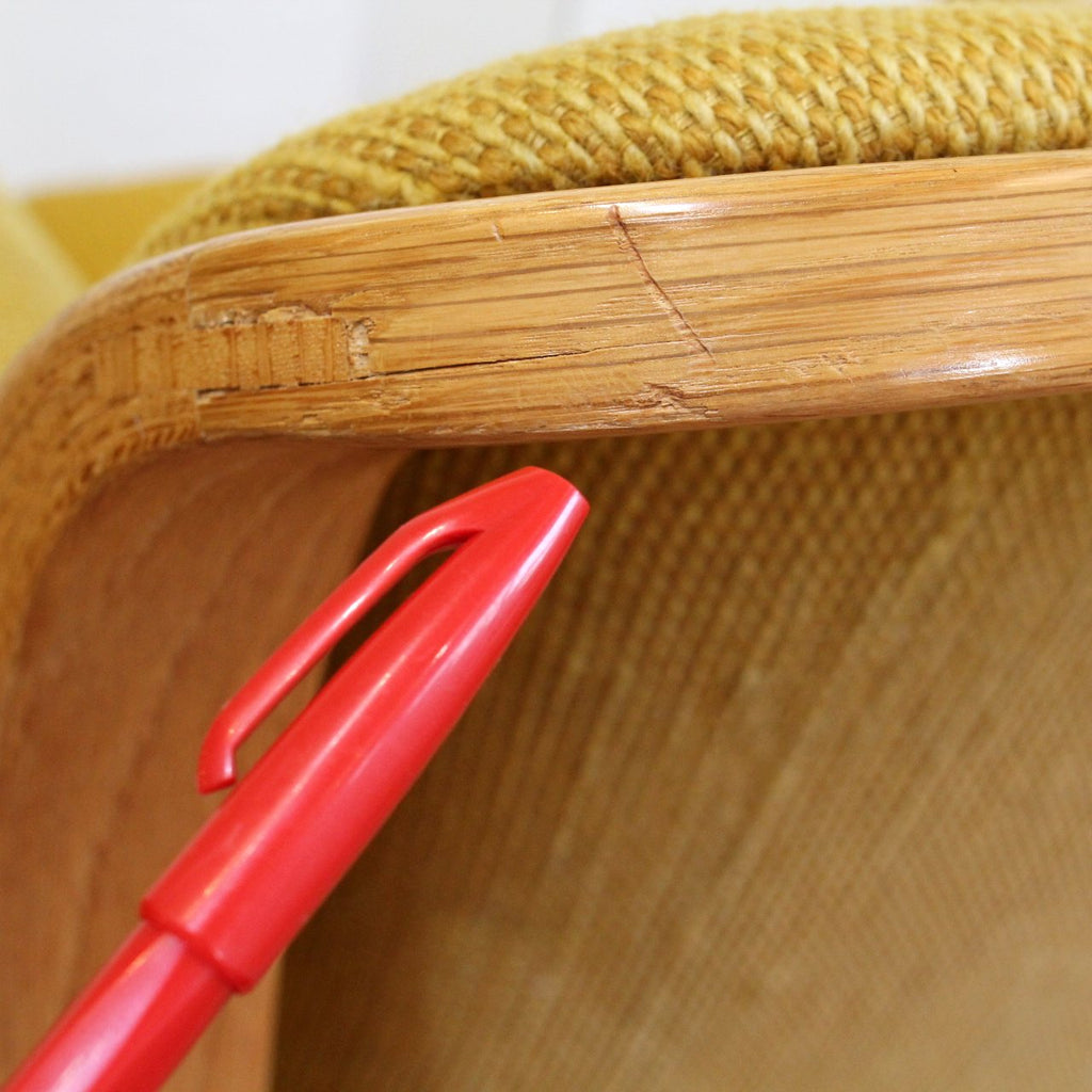 アーム裏のネジが1本代用されています。普段は見えない部分です。ヴィンテージになりますので、それなりに使用感がありますが大変雰囲気のいいチェアです。 - 配送