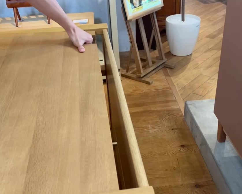 ナラ材の美しさがたまらない学習机。角は面取りが施されており、なめらかな木肌に優しさを感じます。