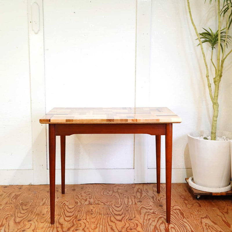 元は違う古い家具で、色味も違えば木目も違う。そんなバラバラな材が一つになってオシャレなモザイク柄の天板として生まれ変わっています。モザイク柄はまとまりがないかと思いきや、大人な落ち着いた雰囲気に仕上がっています。こちらはタイプ【1】の天板模様。