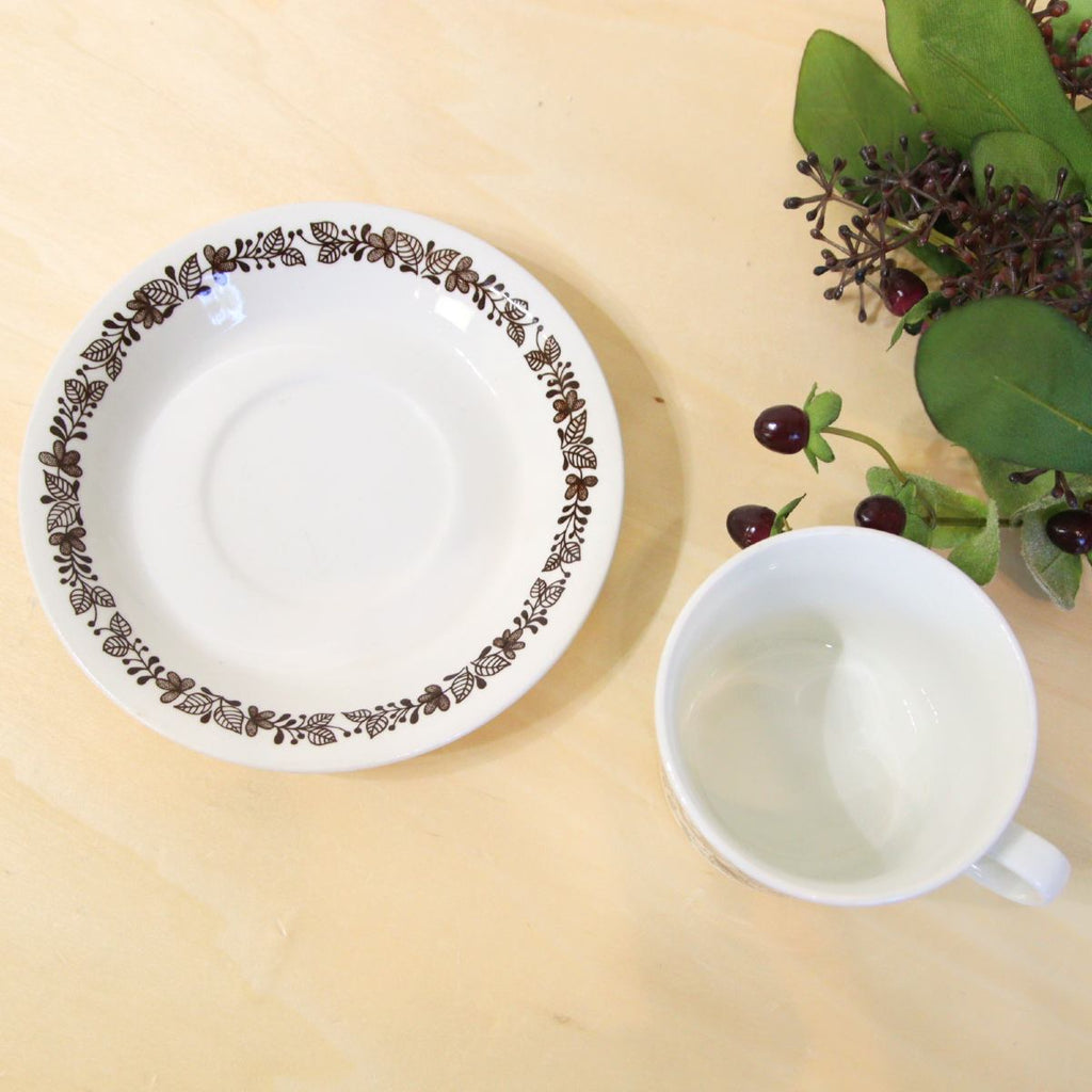 ベルの形をした花、葉、カールが茶色の線で描かれたとても可愛らしい装飾が特徴的。ソーサーには花柄がぐるっと一周しています。素朴で詩的な装飾は、ハッピーでリラックスした気分にしてくれますね。