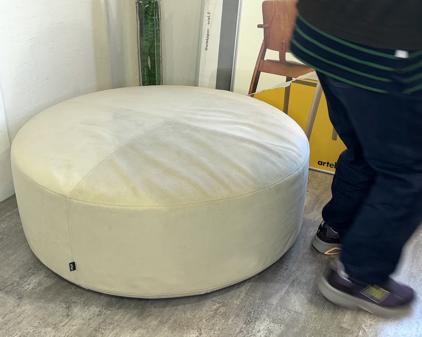 直径約85cmとゆとりのあるサイズ感で、スツールとしてはもちろん、オットマンや簡易テーブルのような使い方も可能。人が自然と集まる“場”をつくるようなプロダクトです。