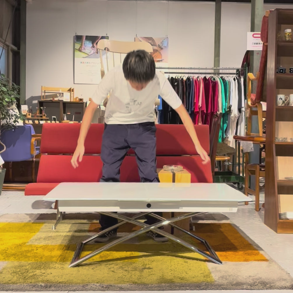 ガラス製の、伸長昇降する機能性テーブルはあまり見たことがありません。
