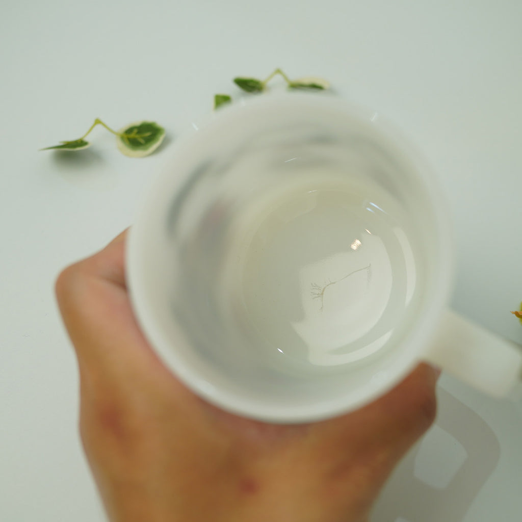 乳白色のミルクガラスのコップ。飲み物を入れると分かりやすいのですが、光りが少し透けるのが特徴です。