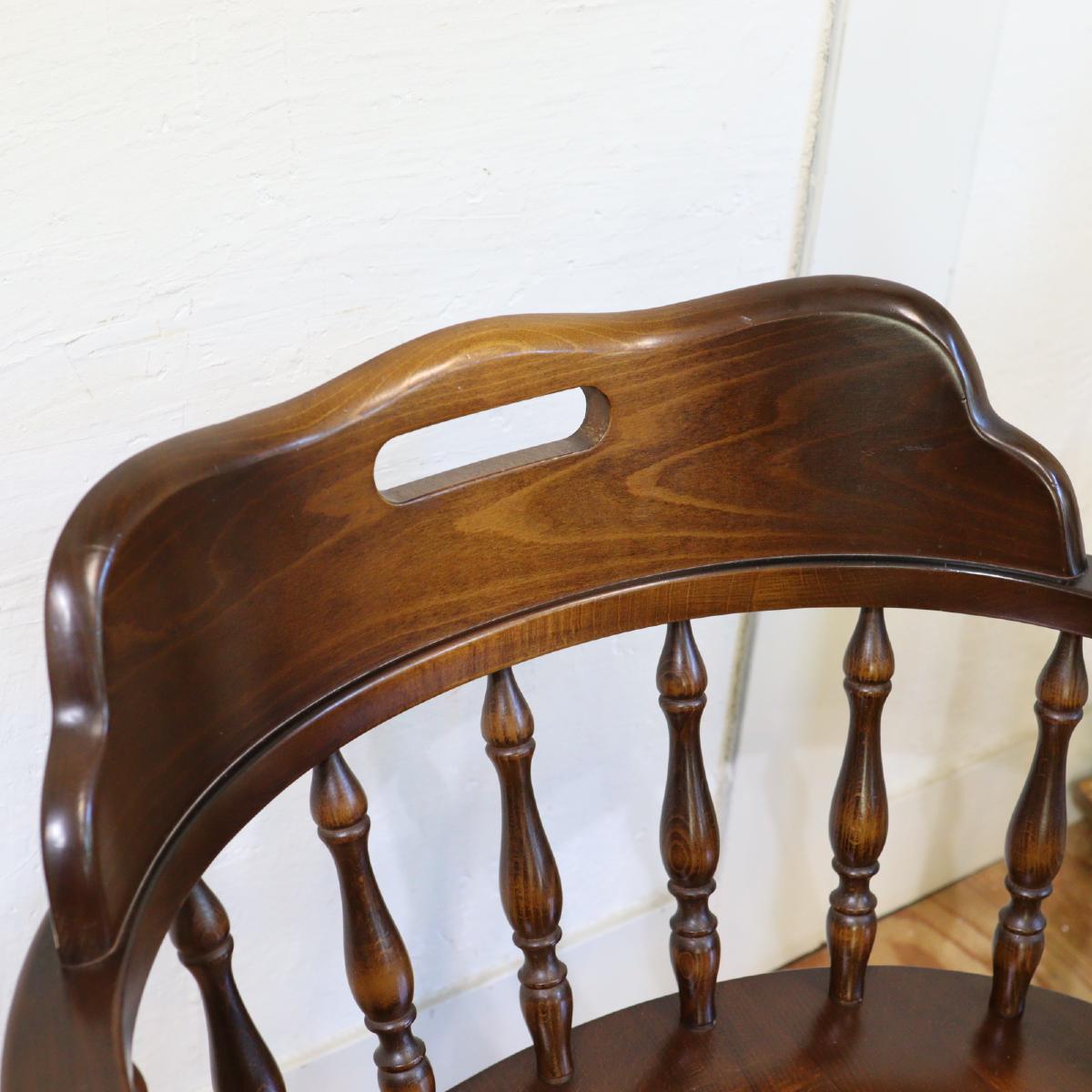 時を経てきたからこそ味わえる木材のツヤや職人によるろくろ細工の精巧さに、うっとりしてしまいます。半円を描くように背もたれとアームが一体となっていて、背中を優しく包み込んでくれます。なめらかな手触りもまた良きです。