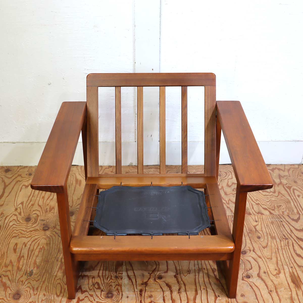 バランスの取れたフォルムが美しく、チーク材を使用したシンプルな直線的なアームが印象的。"木"の素材の良さも経年によって引き立っており、深みのある雰囲気です。