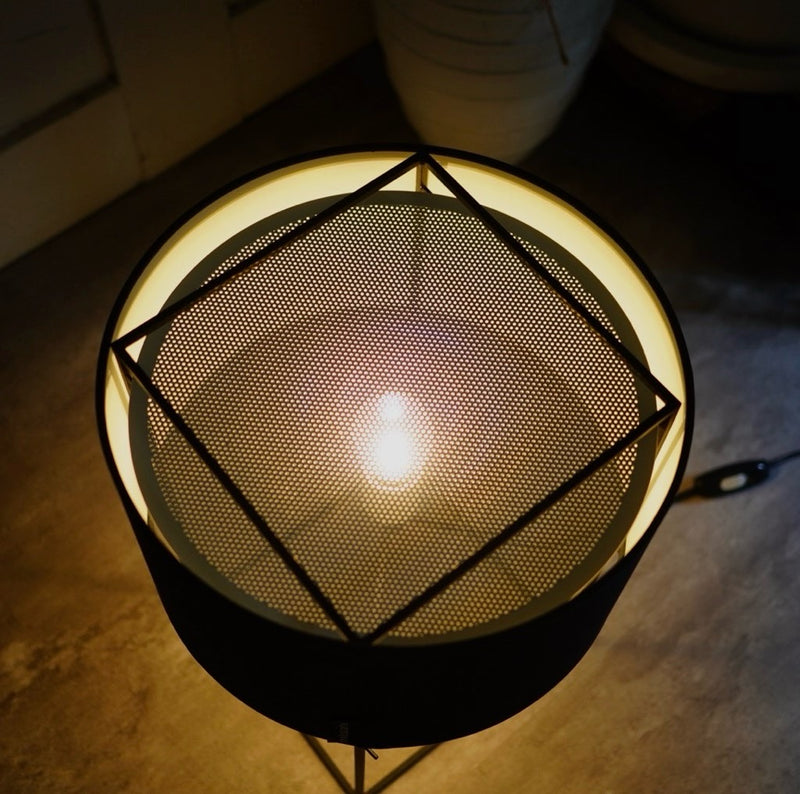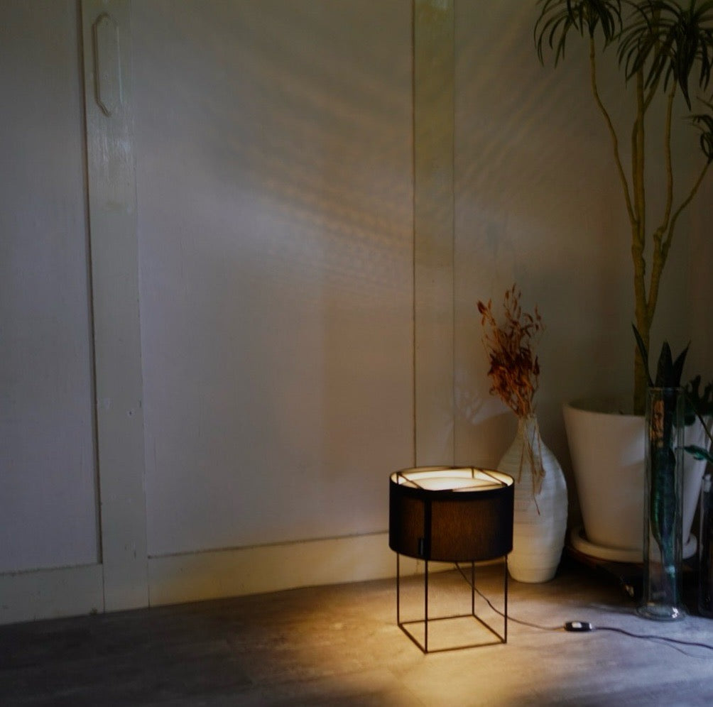 四角いブラックのフレームに筒型のファブリックシェードが乗っています。シンプルでモダンな独特の存在感を持っています。