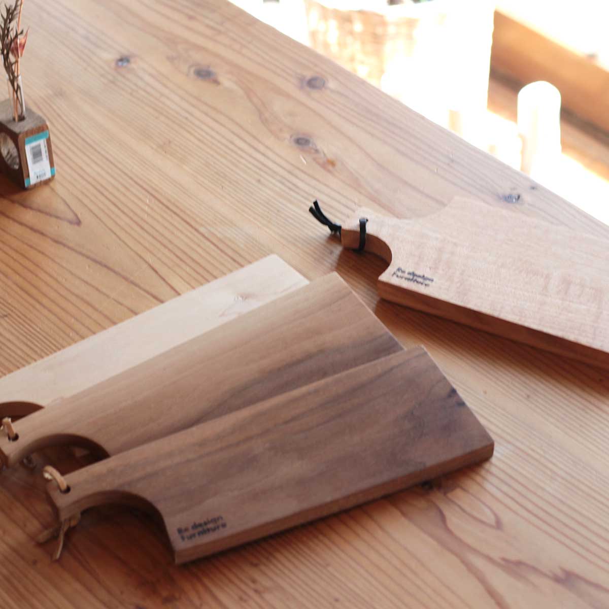 リバイブモブラープロジェクト ウォールナットのカッティングボードです。リサイクルできる古い家具からリメイクされたリスタイルオリジナルのカッティングボードで、SDGsへの取り組みの一環として製作したものです。