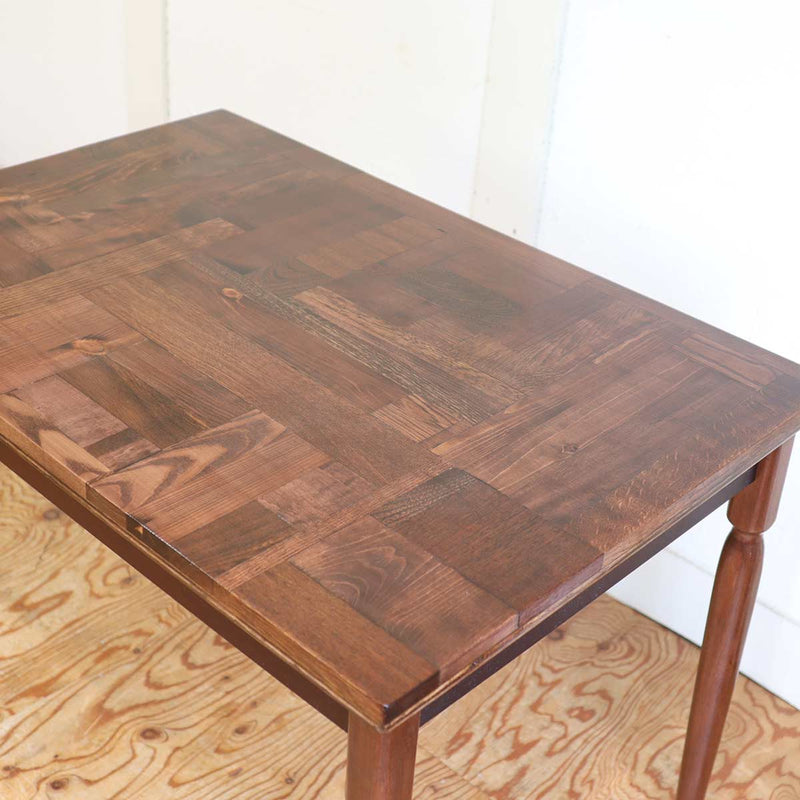 元は違う古い家具で、色味も違えば木目も違う。そんなバラバラな材が一つになってオシャレなモザイク柄の天板として生まれ変わっています。モザイク柄はまとまりがないかと思いきや、大人な落ち着いた雰囲気に仕上がっています。