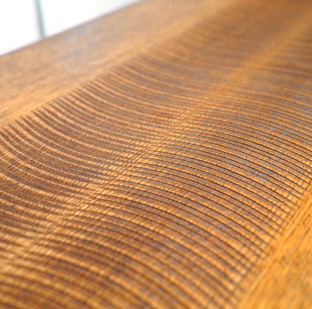 天板には一刀一刀彫ったであろう模様が本当に美しい!彫りによって現れる模様や濃淡はオーク無垢材ならでは。