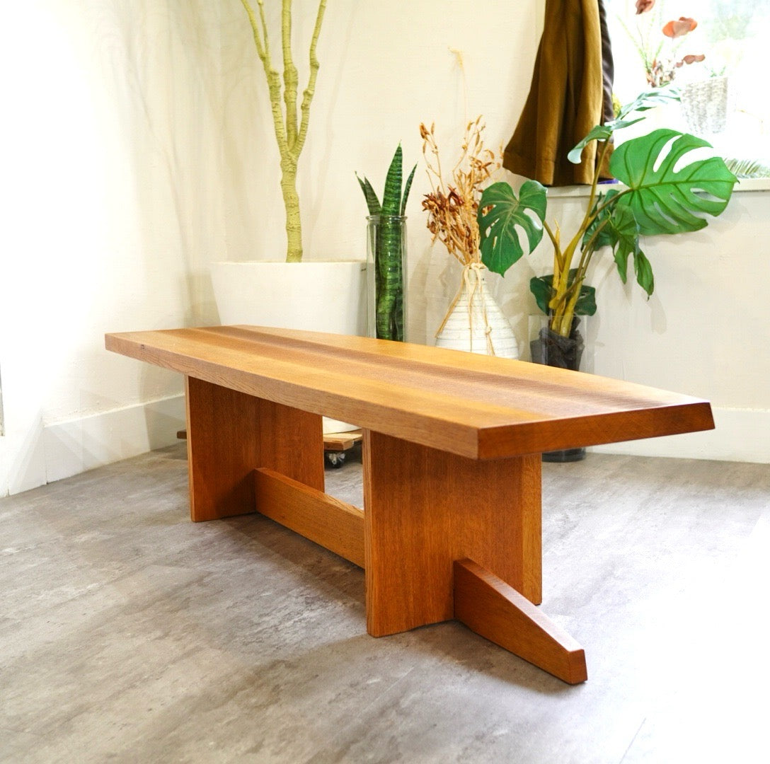 どっしりとした佇まいで木の良さを存分に堪能できます。片側が緩やかな弧を描いて、頑丈さだけでなく、優しさも漂わせています。