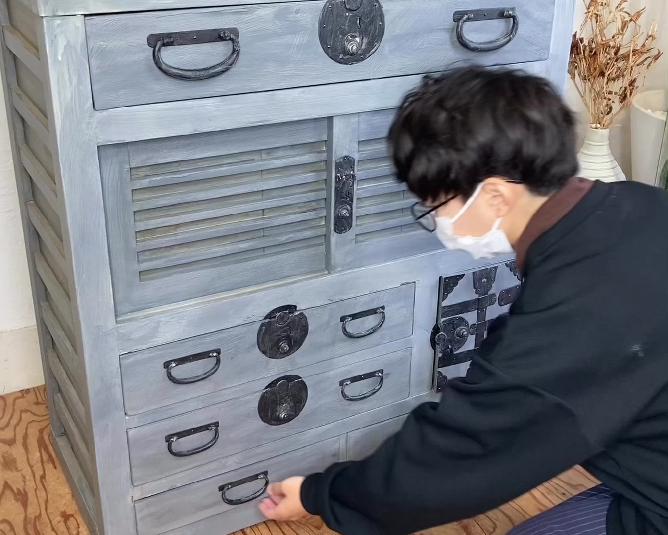 水屋箪笥とは江戸時代の食器棚のことで、昔は水を扱う台所を"水屋"と指していたことからそう呼ばれました。