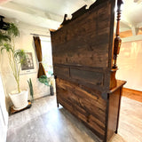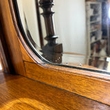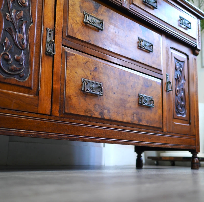 アンティークの雰囲気がたまらないサイドボード。大きな鏡と美しい装飾が魅力的です。上段のミラーは乗せてビスで軽く固定されてるだけなので、下段のサイドボードだけの使い方も。(天板部分には上段がはまっている分のくぼみがあります。)