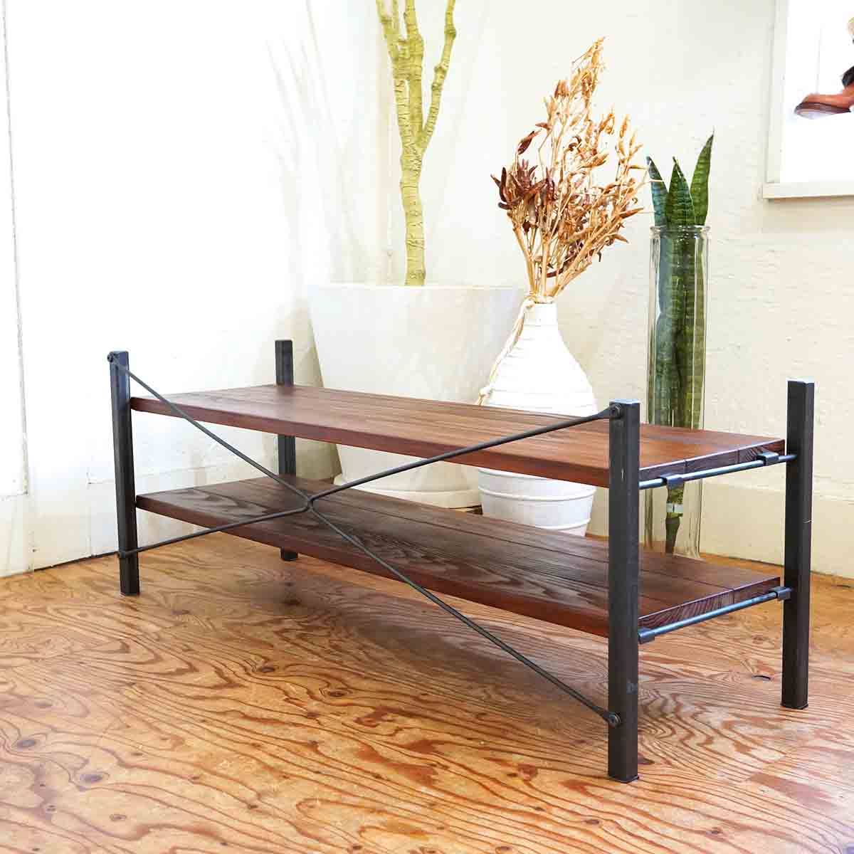 アイアンのフレームと木の棚板の組み合わせがカッコよく、インダストリアルな雰囲気を感じられます。背面も側面もフレームのみのテレビボードなので圧迫感のないスッキリとした印象で、どんなお部屋にも合わせやすデザインです。
