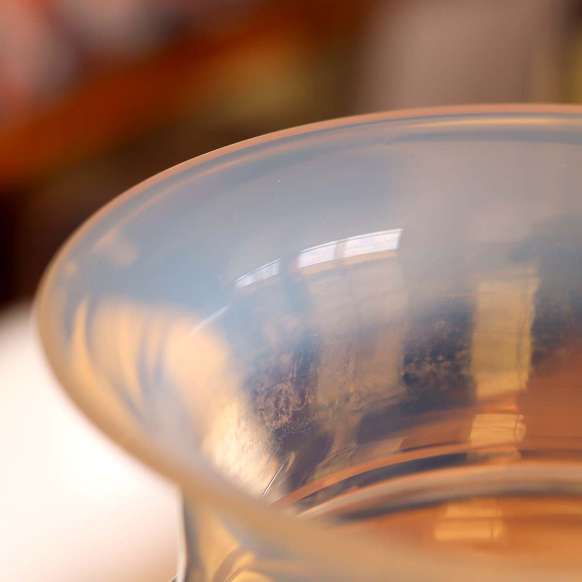 シグネのフラワーベースの中でも、この半乳白色はとても珍しいガラスです。通常はクリアガラスで薄手に仕上がっていますが、半透明な乳白色のガラスはクリアのものより厚手に作られています。