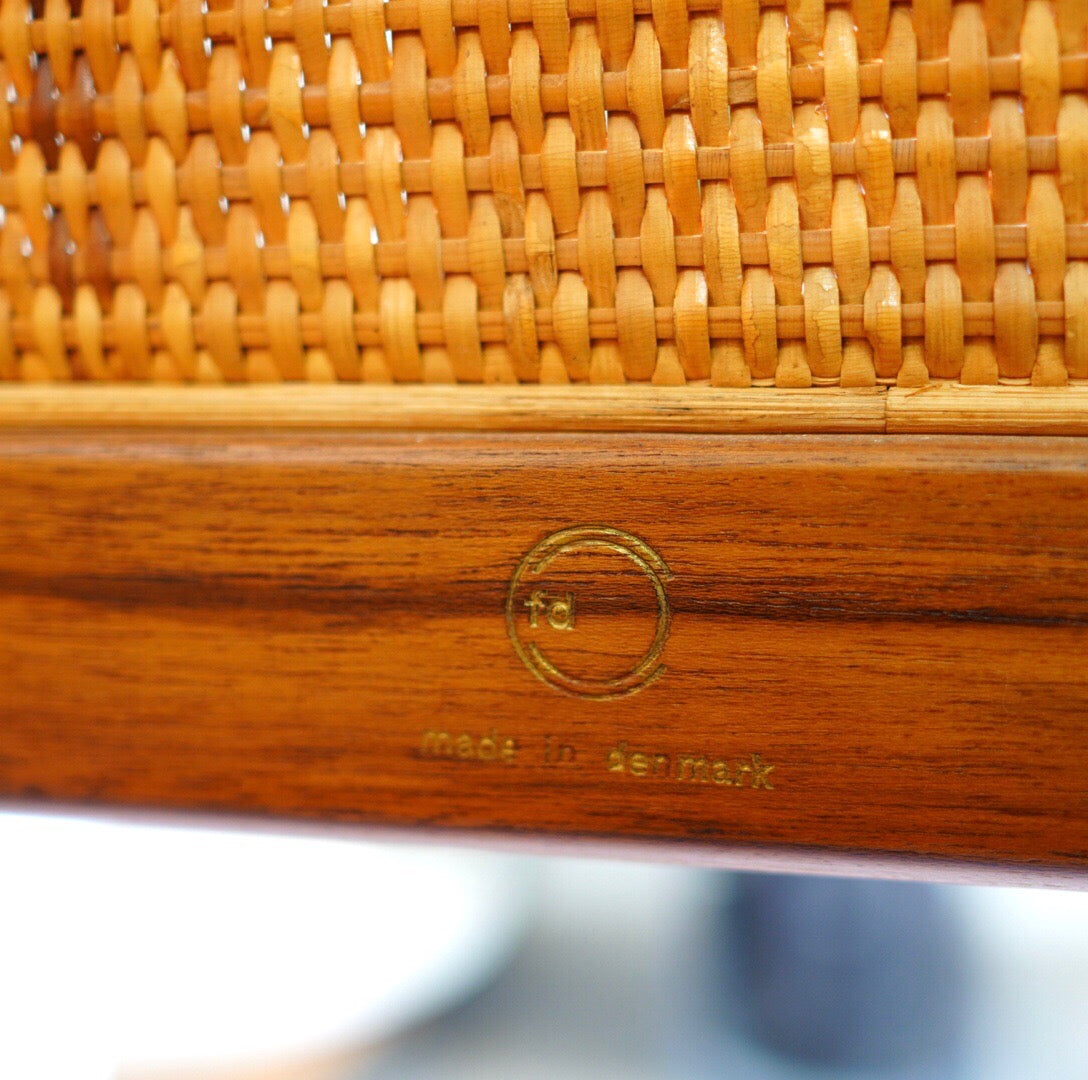 籐(ラタン)の編み込みが繊細に施された背もたれとアームは、軽やかで開放感のある印象を与えます。さらに、しっかりとしたチーク材のフレームが長年使用しても安定感を保ち、北欧家具特有の高い耐久性を備えています。自然の木目と籐の質感が絶妙なバランスで融合し、視覚的にもリラックスできる一品です。