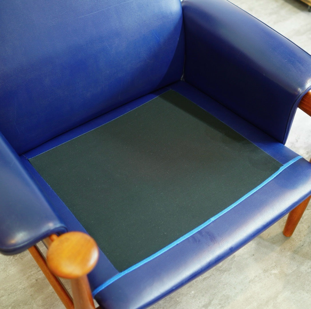 オットマンのクッション下の破れを当て布テープにて補修しています。