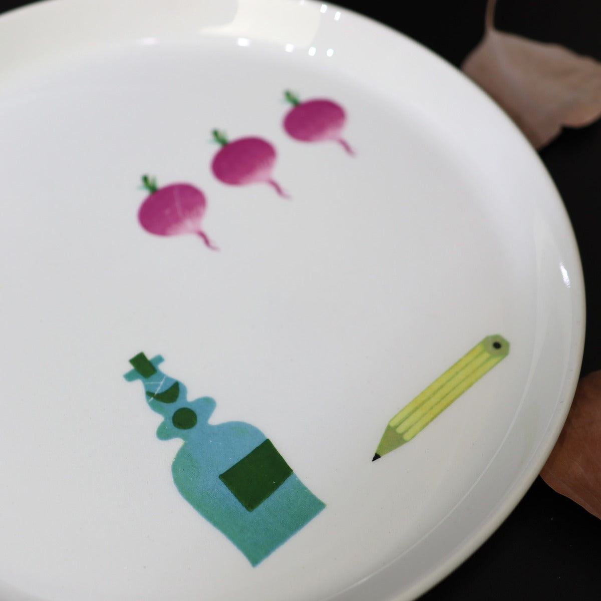 21㎝プレートには、ラディッシュ、ボトル、鉛筆、植物のえが北欧らしい色味とタッチで描かれています。同じピンタシリーズでもアイテムやプレートのサイズによって、全く違う絵柄が描かれているそうです。どんな絵柄なのか、気になっちゃいますね。