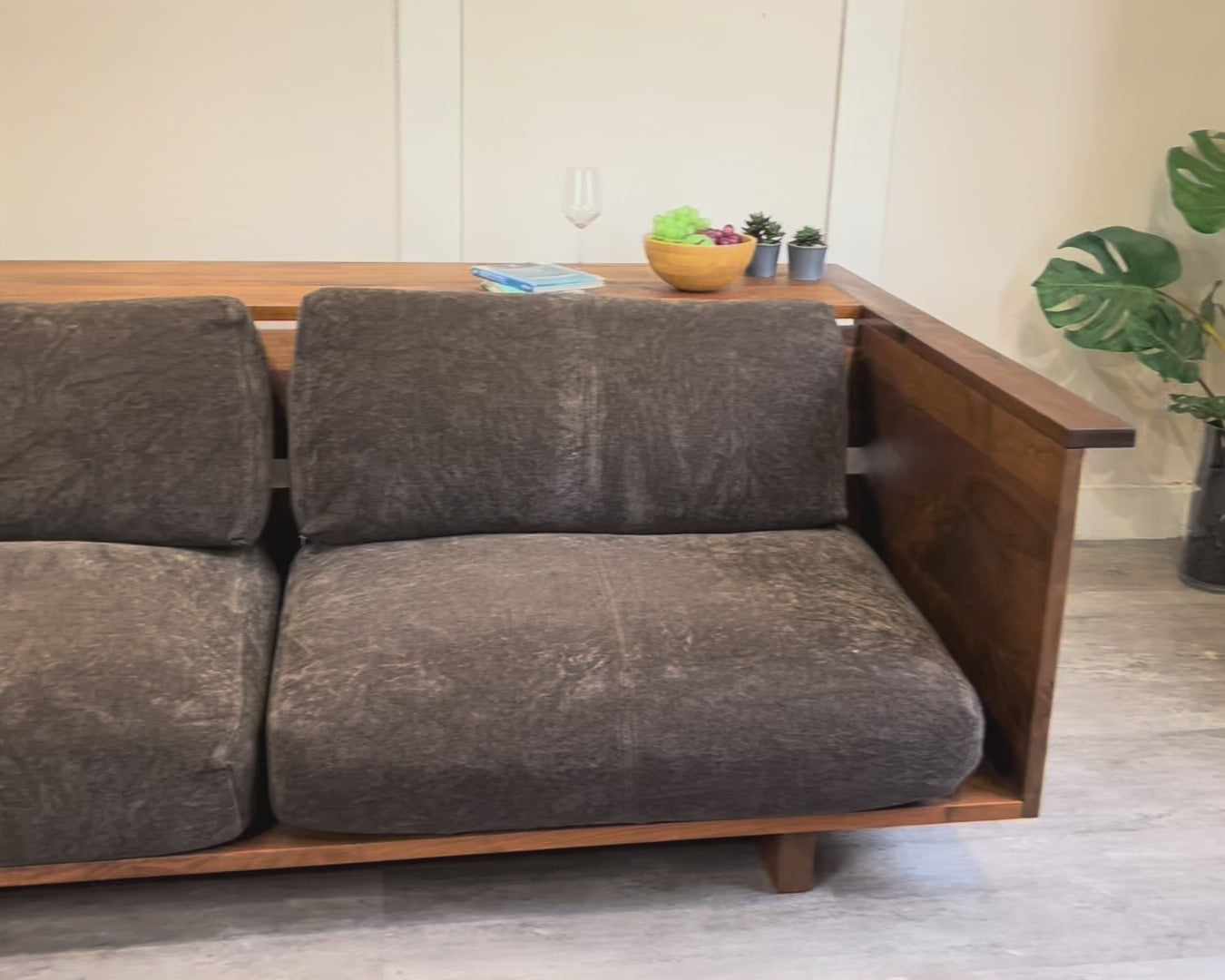 こちらのソファ、実は「カウンターソファ」。何かというと、背面に天板と棚が付いていて、収納やカウンターのように使えるというアイデア家具!