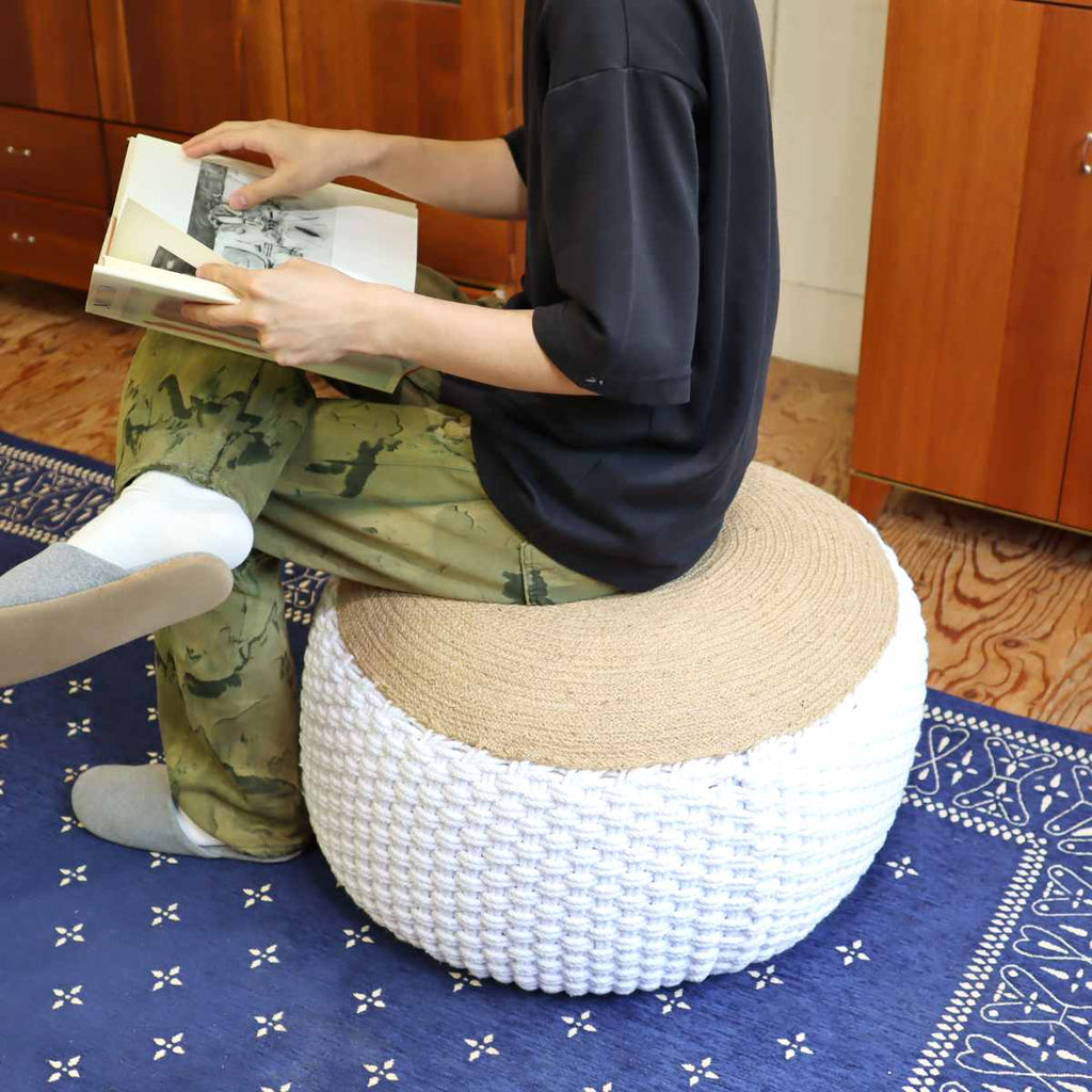 側面はロープを編み込んだ作り、座面はジュート(黄麻)を編みつけた造りとなっております。詰め物はポリエステルがギュッと詰まっていて、固い座り心地です。