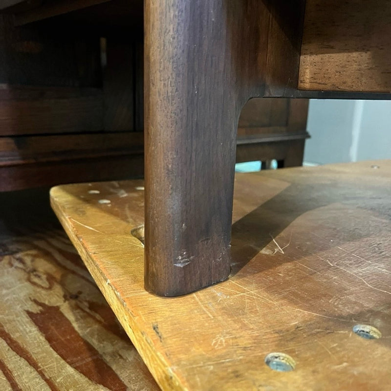 こちらは、メーカーよりアウトレットB品として入荷してまいりました。元々天板に反りが合ったようで、メーカー側にて天板をピスと木ダボにより補修されている箇所があります。