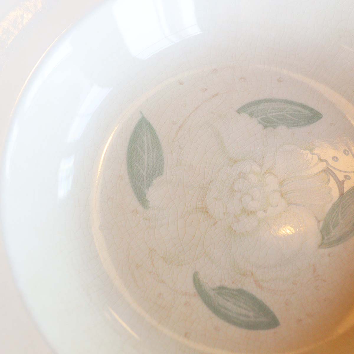 深く淡いグリーンの葉と、オフホワイトの花がデザインされたプレートです。淡い色味やデザインをしていますが、プレートの中央にデザインされた花は存在感があります。